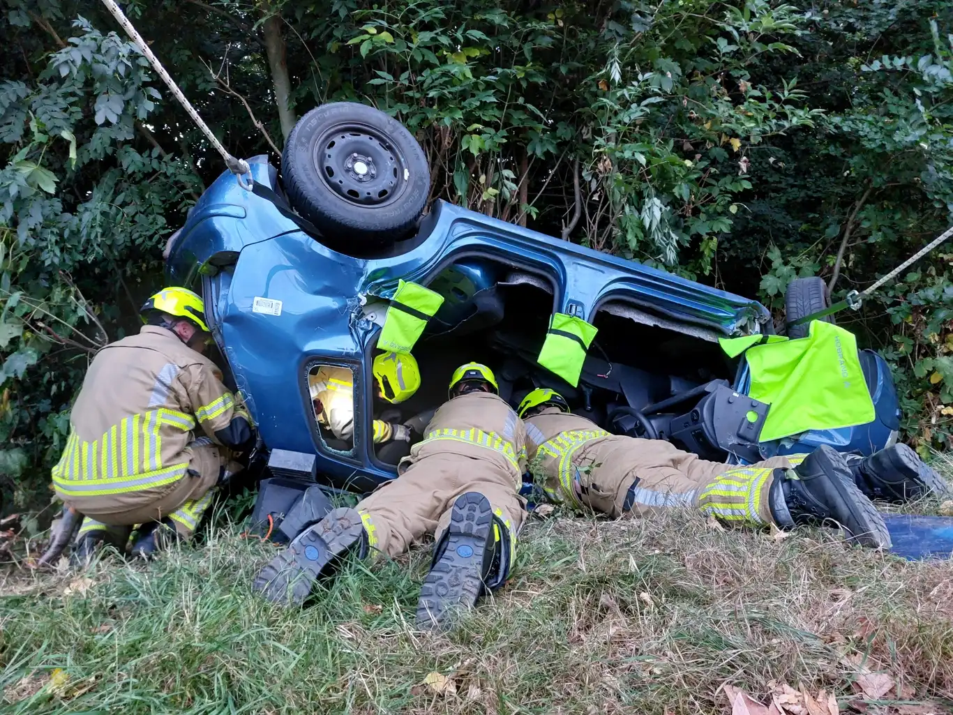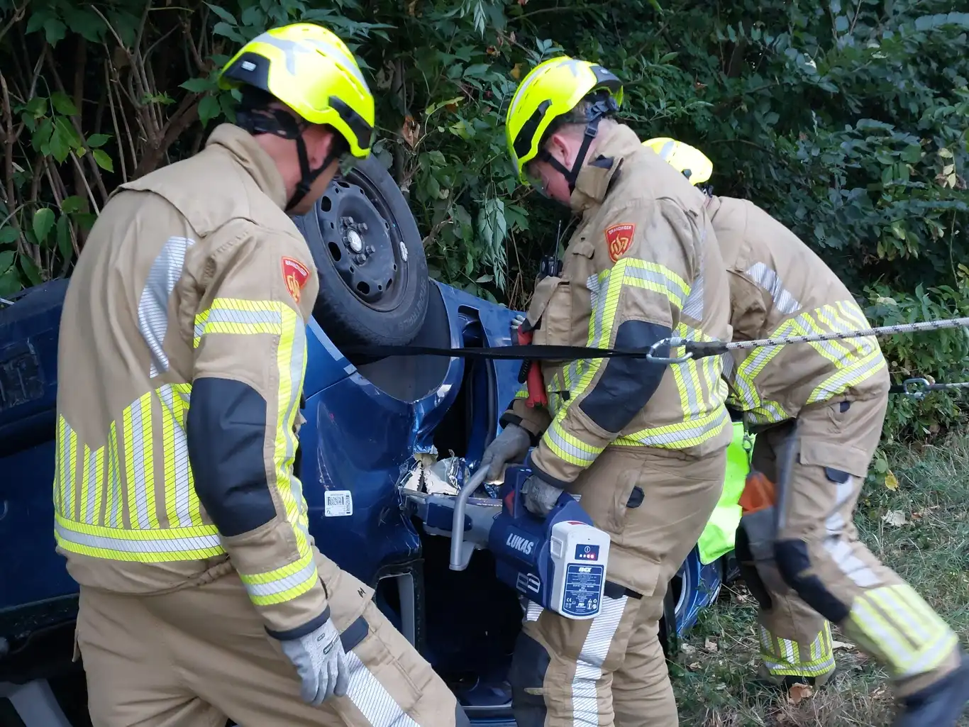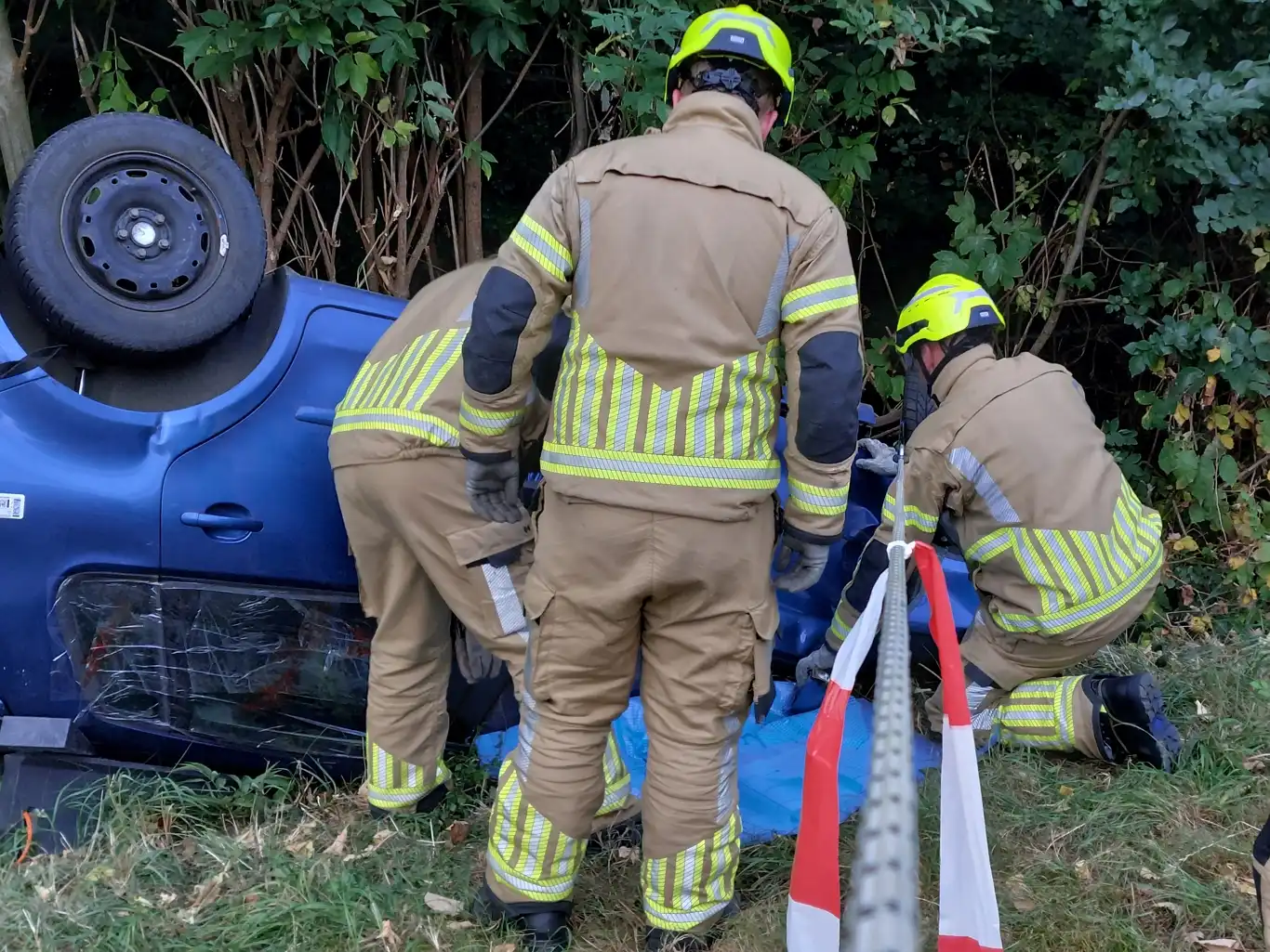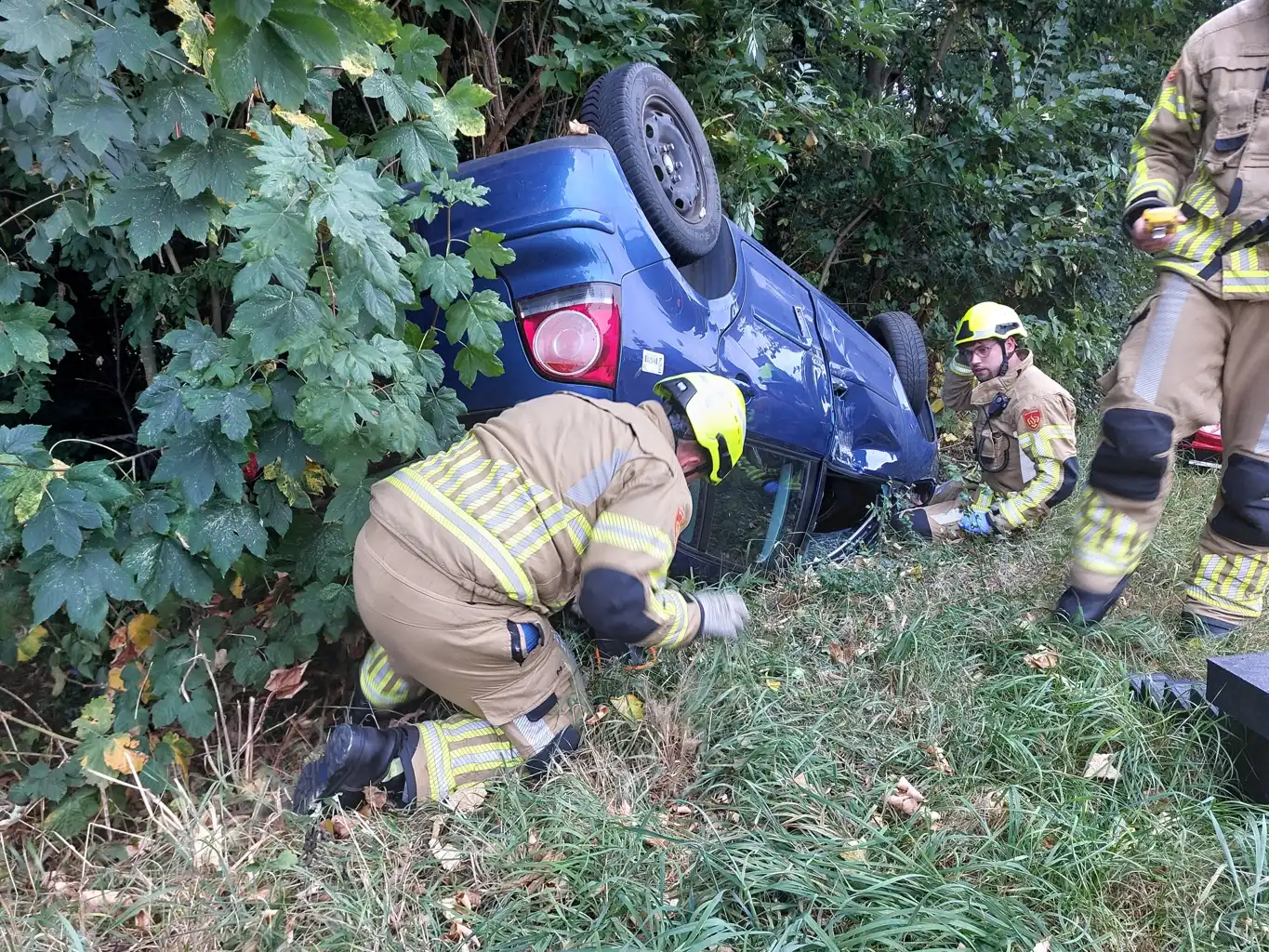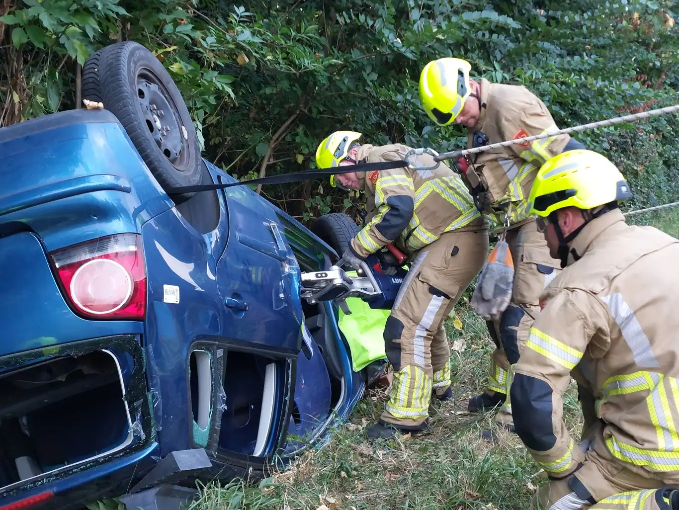 De brandweer stelde de auto veilig en stabiliseerde deze. Daarna knipte ze de auto open om de slachtoffers te bevrijden.