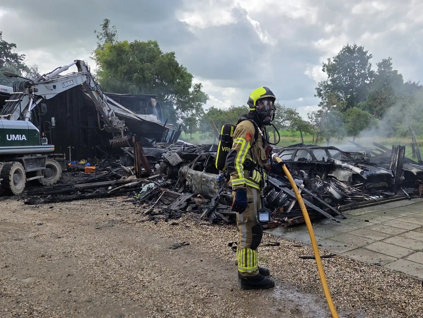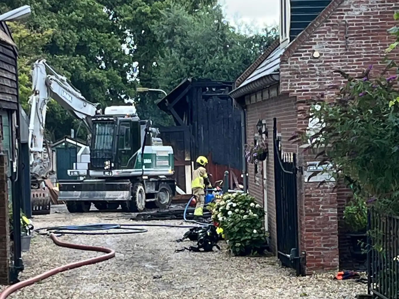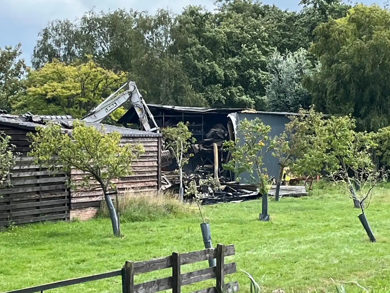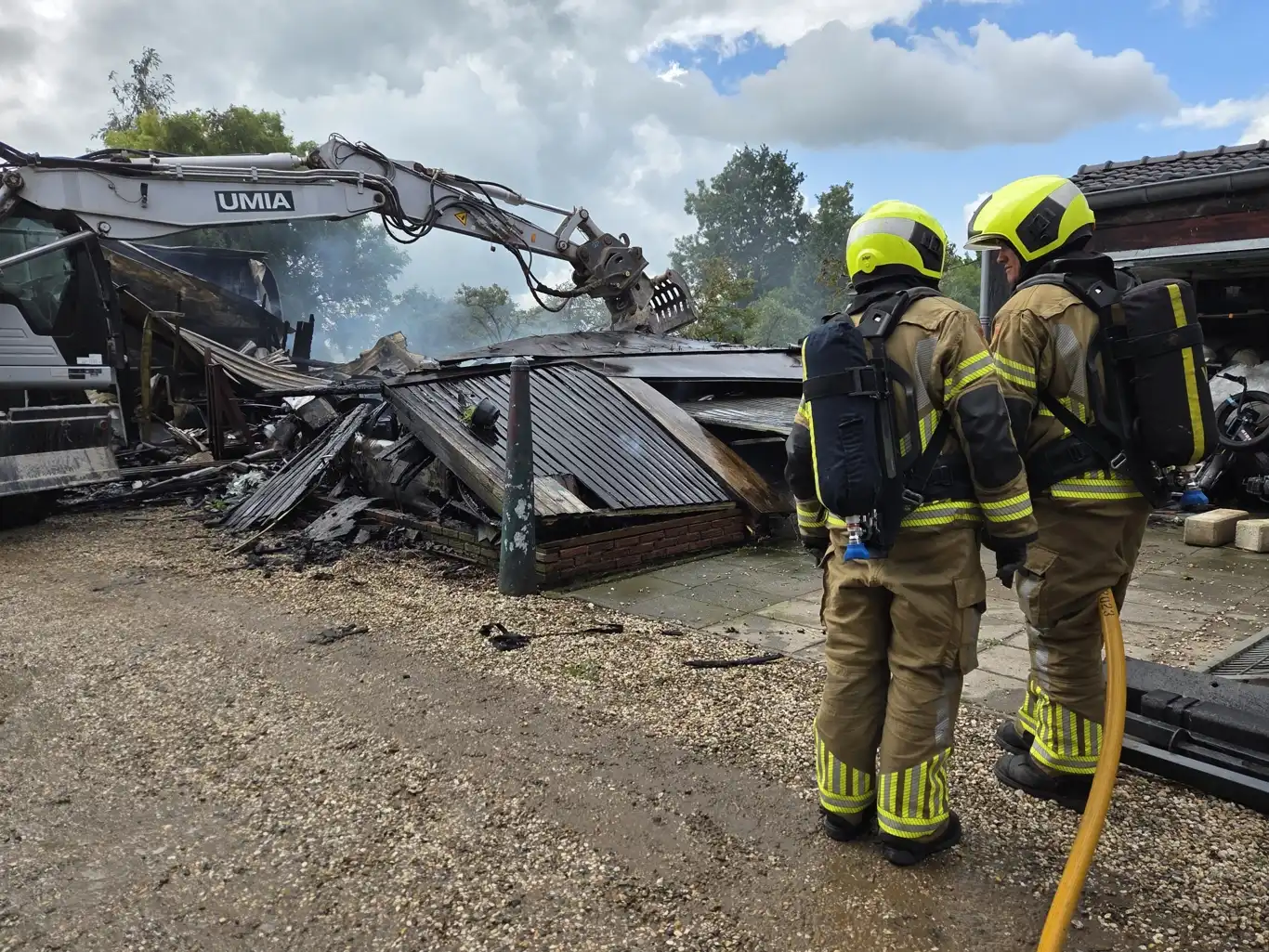 De brandweer had het vuur aan het eind van de ochtend onder controle. Met een kraan werd de schuur uit elkaar gehaald.