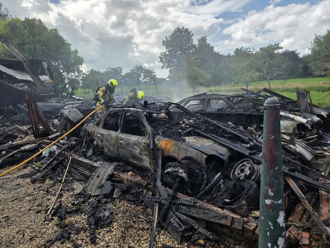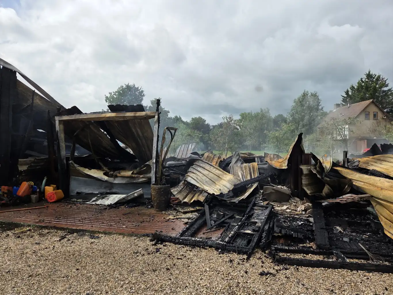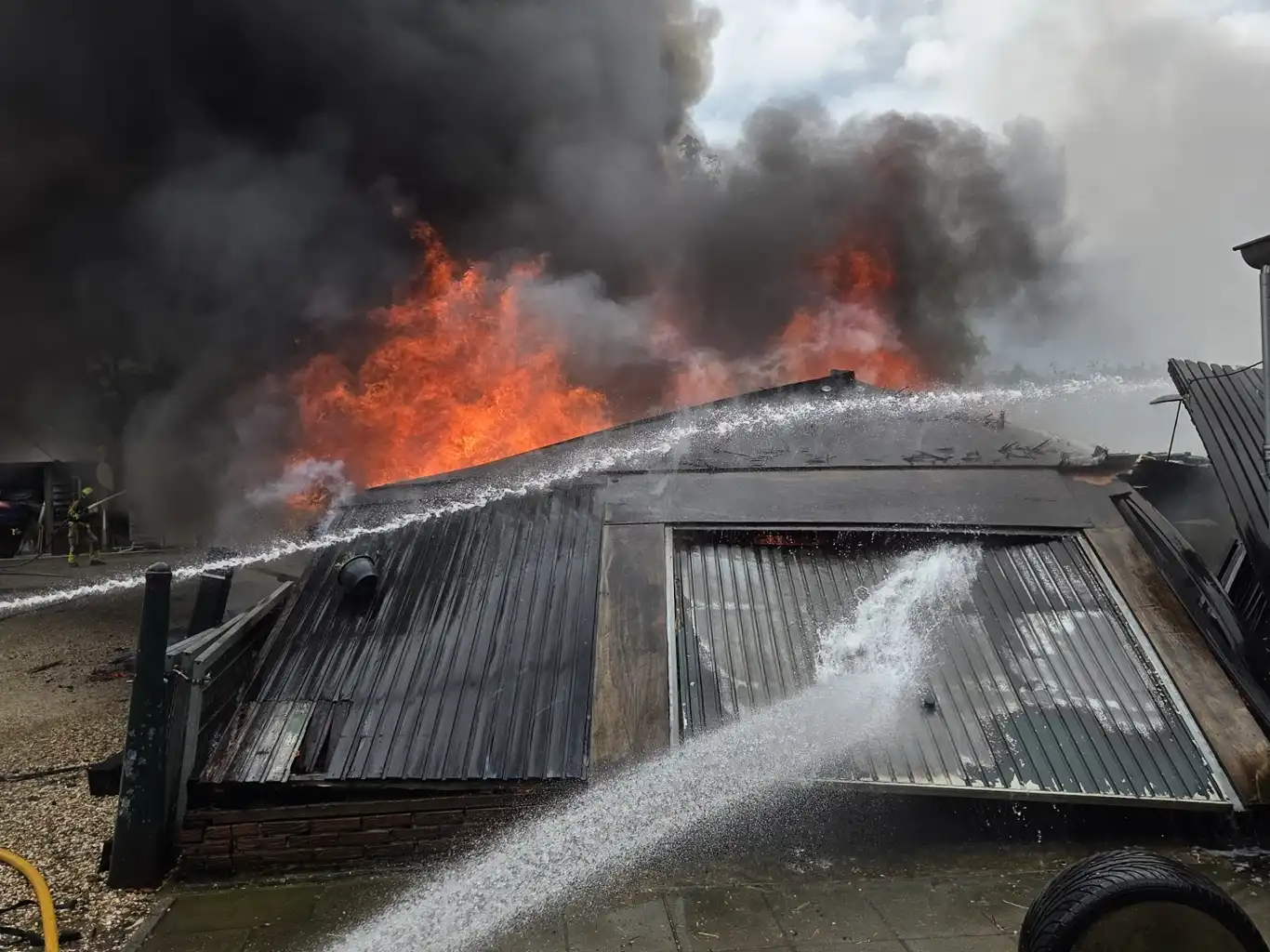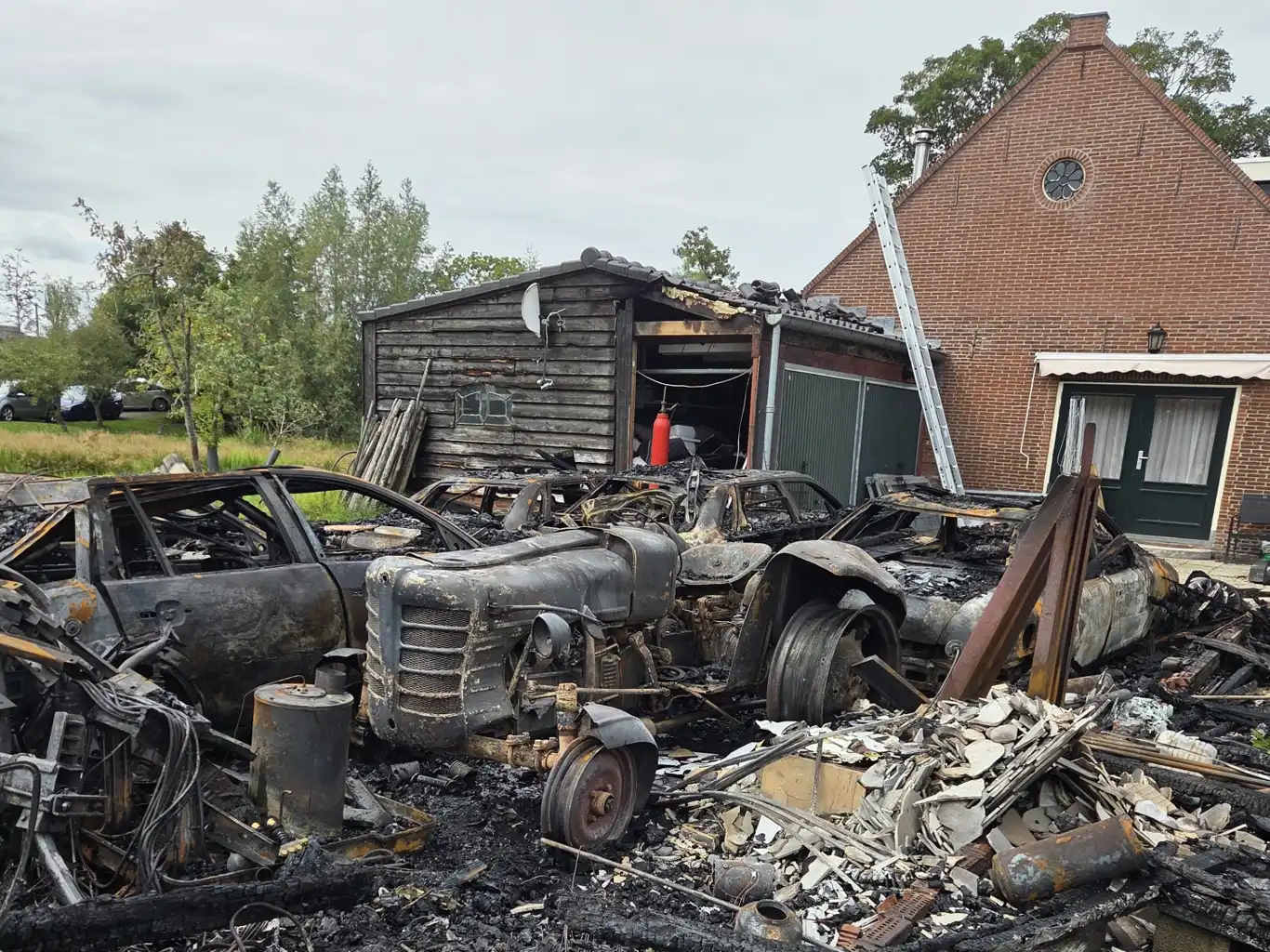 De brandweer had het vuur aan het eind van de ochtend onder controle. Met een kraan werd de schuur uit elkaar gehaald.