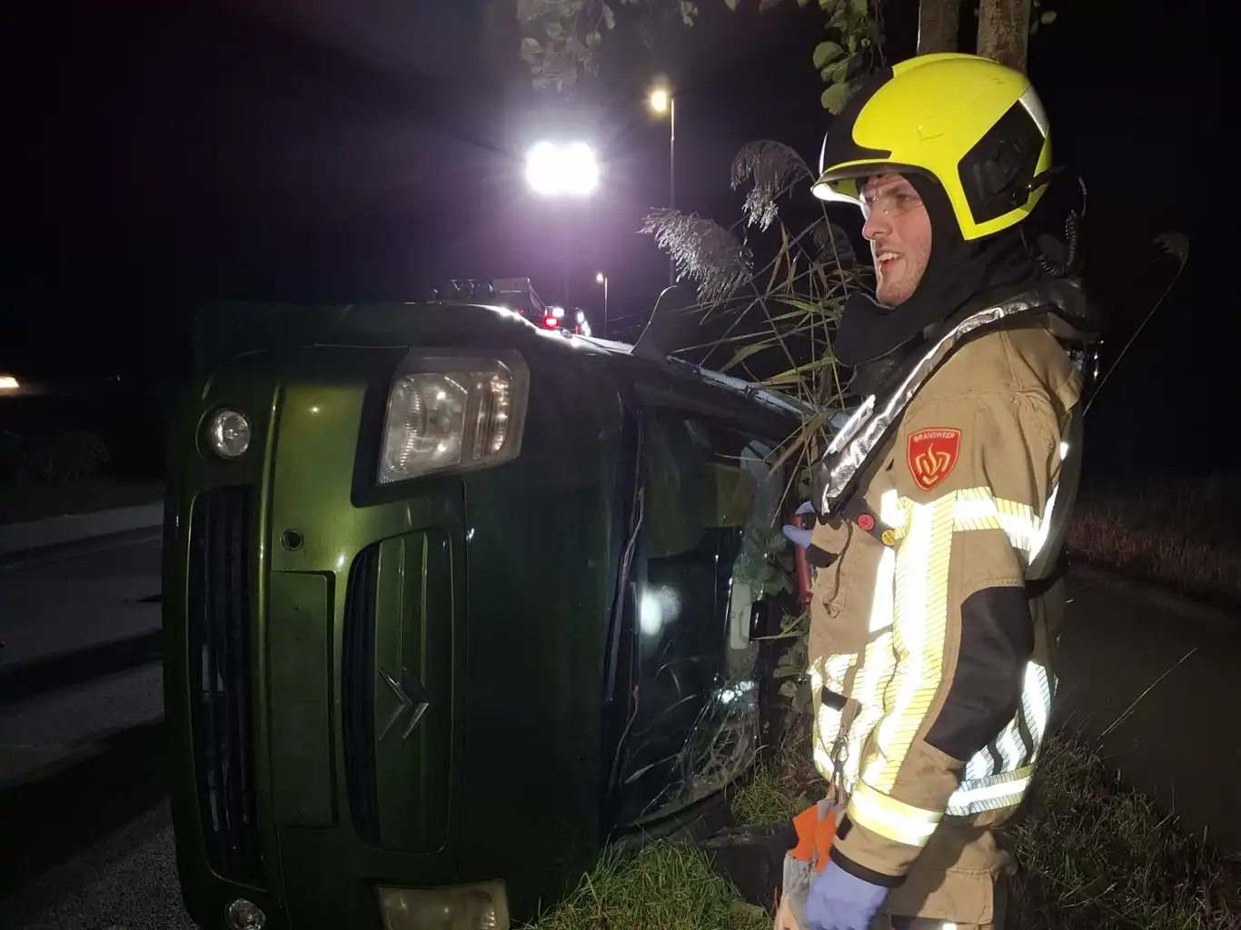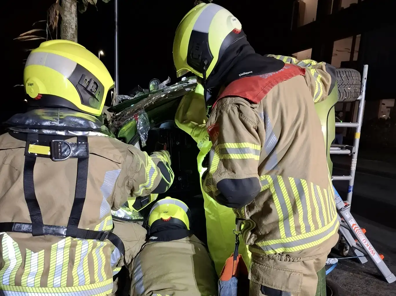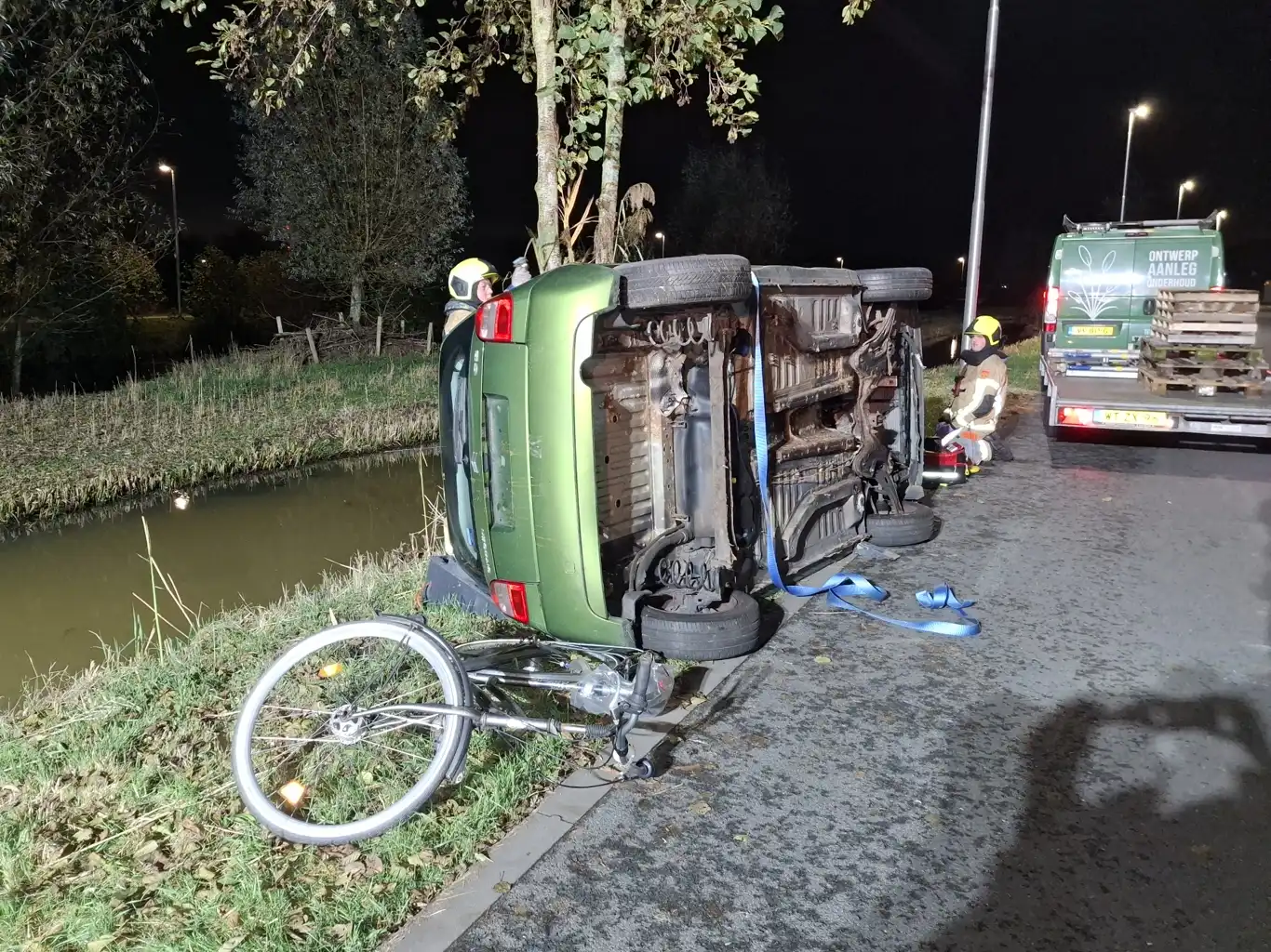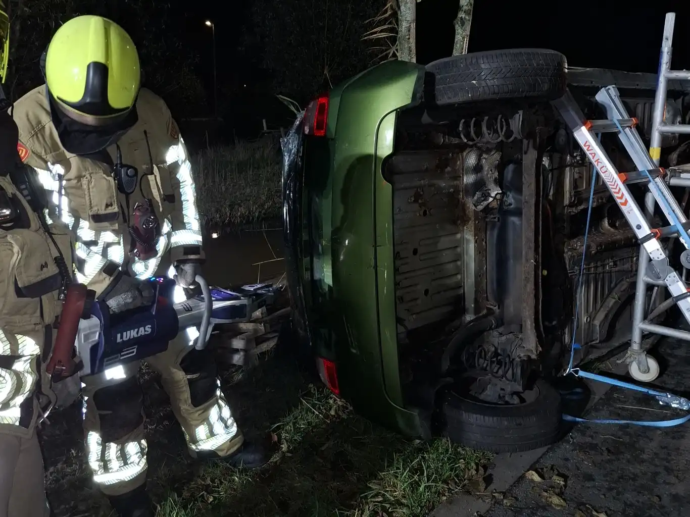 De andere groep oefende aan De Smaragd. Daar lag een auto op zijn kant. In de auto zat een persoon vast. De auto had ook een fietser geraakt. De fiets lag onder de auto.