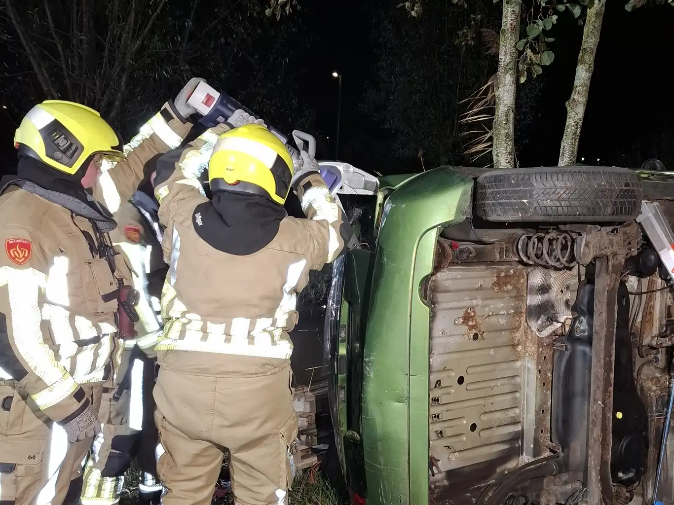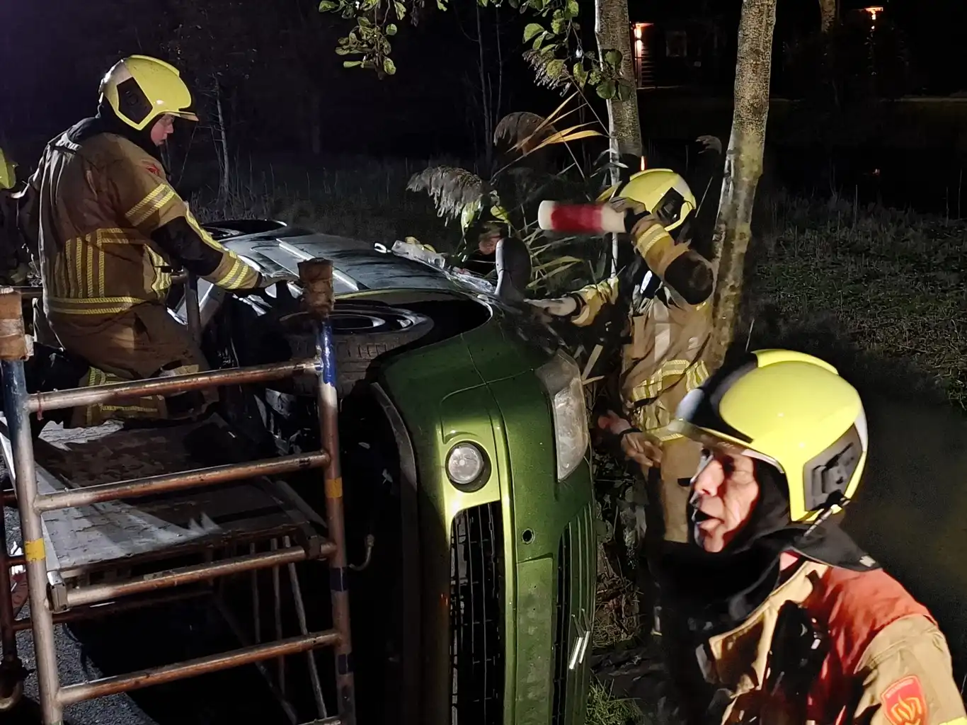 De brandweer gebruikte een steiger en een stapel pallets. Daarmee kon ze veilig bij het slachtoffer komen. Via de achterklep bevrijdde ze het slachtoffer.